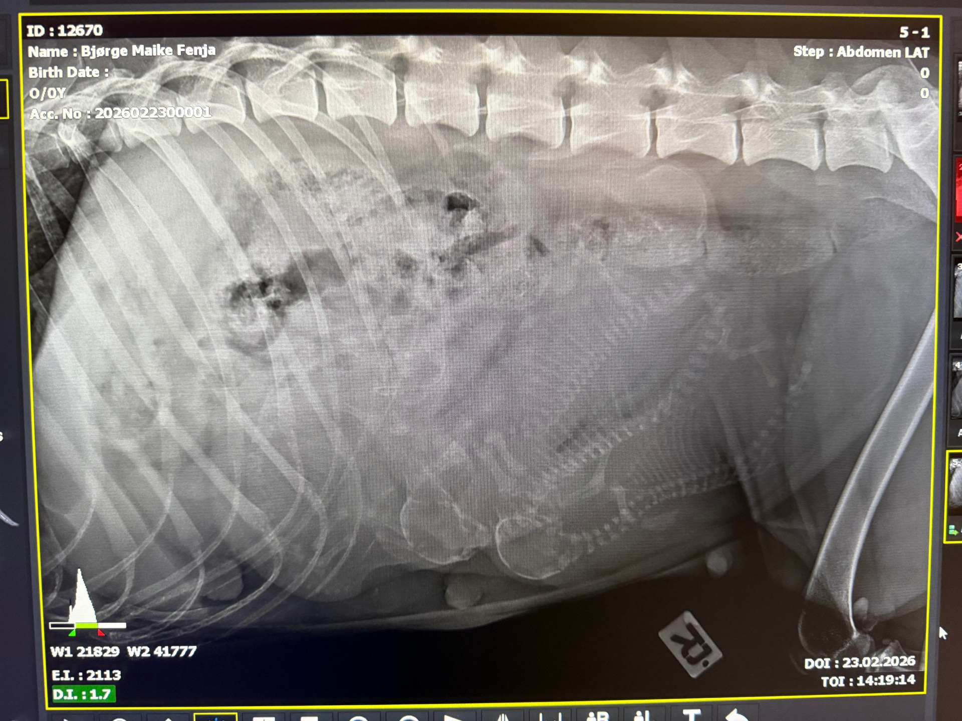 Det første bildet av A-kullet vårt. Fire valper viser seg tydelig på røntgenbildet.